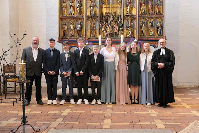 v.l.n.r.: Pastor Ortlieb, Maximilian Misselhorn, Anthony Sixten Schwauna, Kjell Carlsson, Jugo Maas, Malia Holtz, Alva Greta Mentz, Lara Lischak, Clara Nova Pommerenke, Diakon Krause